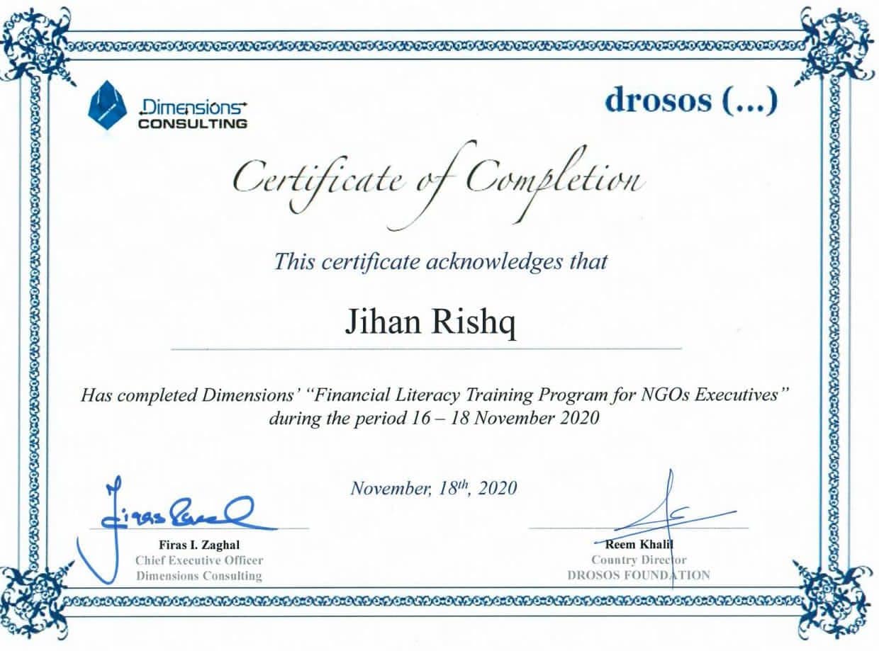 According to the Forum strategic plan our administrative secretary participated in a building capacity program organized by one of our partners DROSOS to improve the administrative ability for the staff. Jihan represented the Forum in this program and received a certificate of participation.