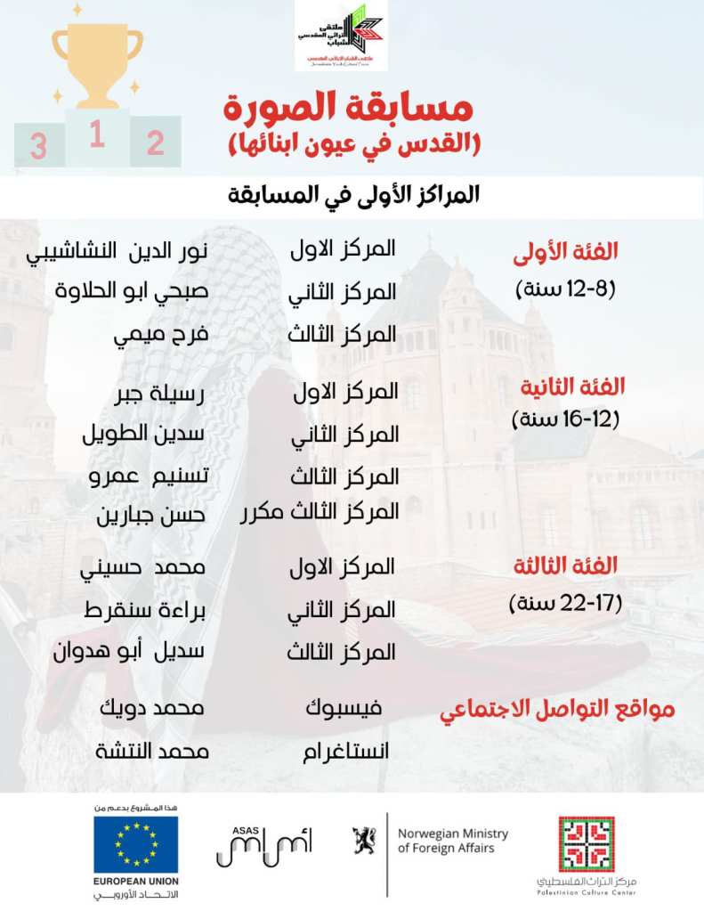Awards were presented to 3 entrants each across 3 age categories (8-12, 13-16, and 17-22). The 7 participants were tasked with showing Jerusalem through their eyes, focusing on one of three categories: Women in Jerusalem, its architecture, and demolished villages, which have been lost to occupation. The winners were then chosen based on the social media interaction received by their photo on Facebook and Instagram.